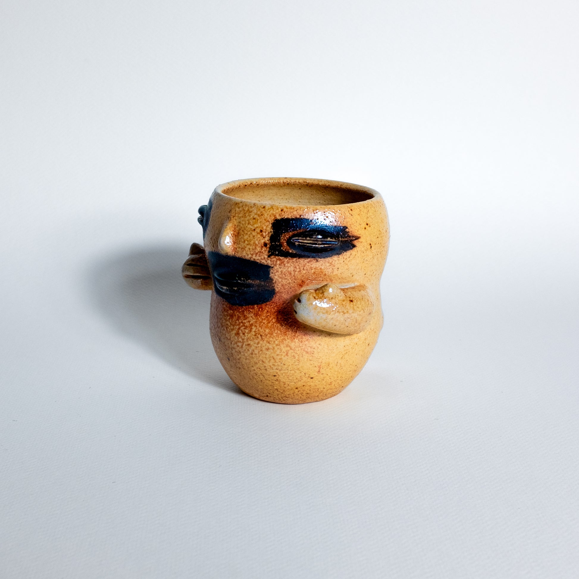 Soda fired little pantat guy. This piece was dipped in a flashing slip and fired in a high fire soda environment