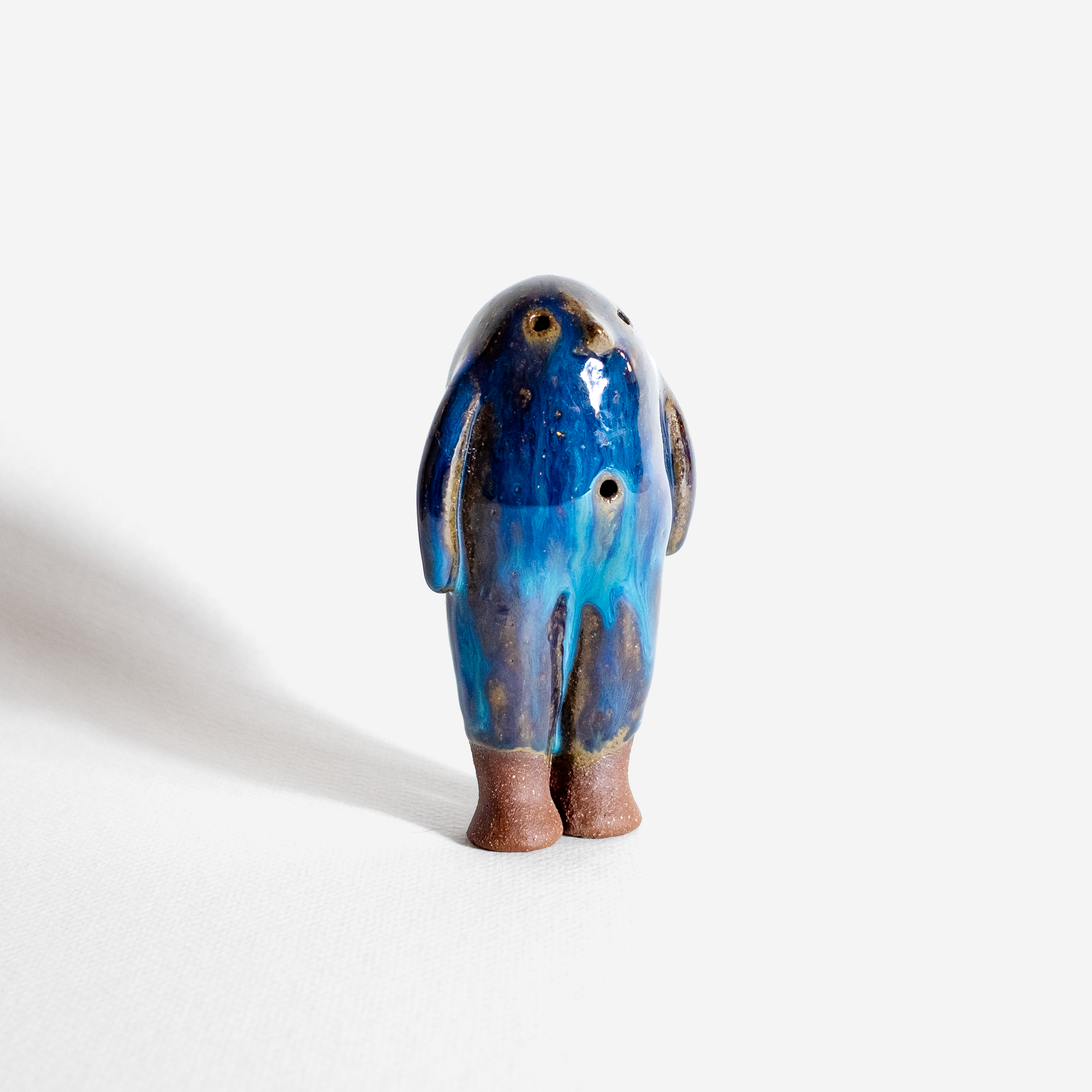 This little figurine is a great companion for the home. Glazed in a blue iridescent glaze.